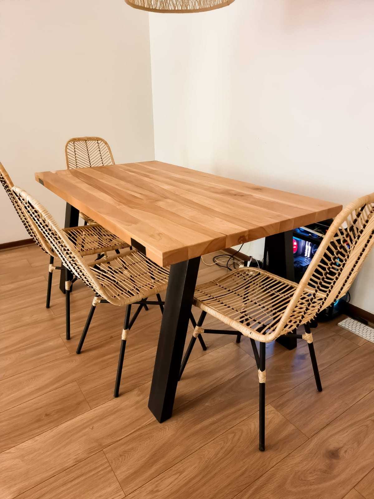 Mesa de comedor con cubierta en madera maciza de 2 pulgadas de espesor trabajada a mano y protegida a la humedad. Base de fierro pintada y protegida al óxido.